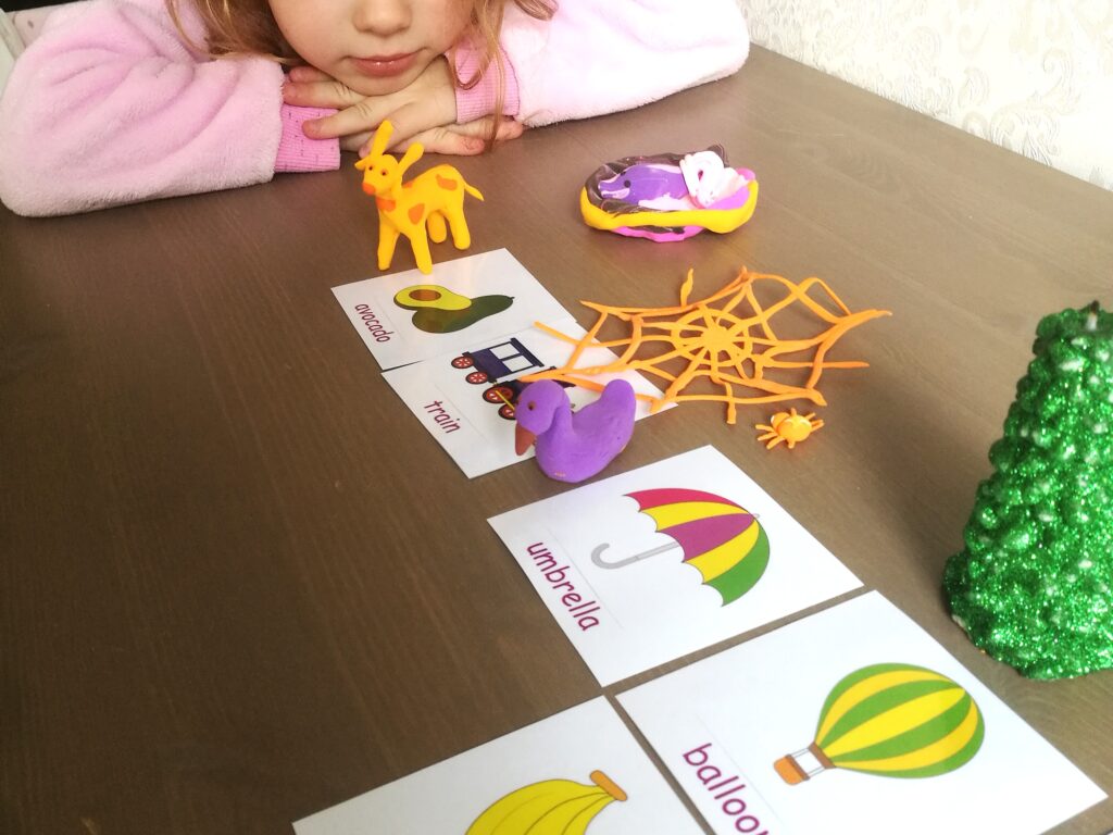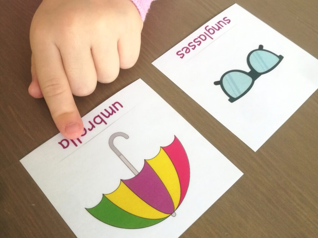We played this game after breakfast when my child was cozy and happy. I laid out two cards and named one word for her to find. When she identified the correct card, I would take them away and introduce a new pair. If she guessed incorrectly, I would simply point to the right card and move on.