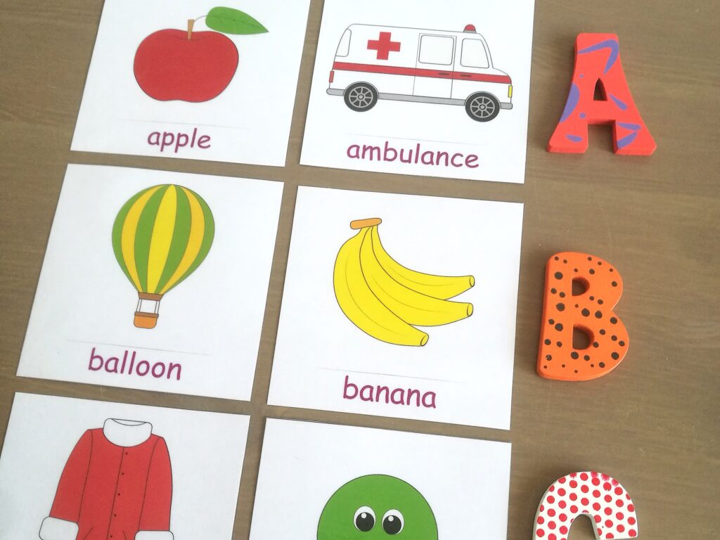 Similar to the previous activity, children identify the first sound from flashcard words. To increase difficulty, cut off the words, leaving only pictures, or print cards with pictures only.
